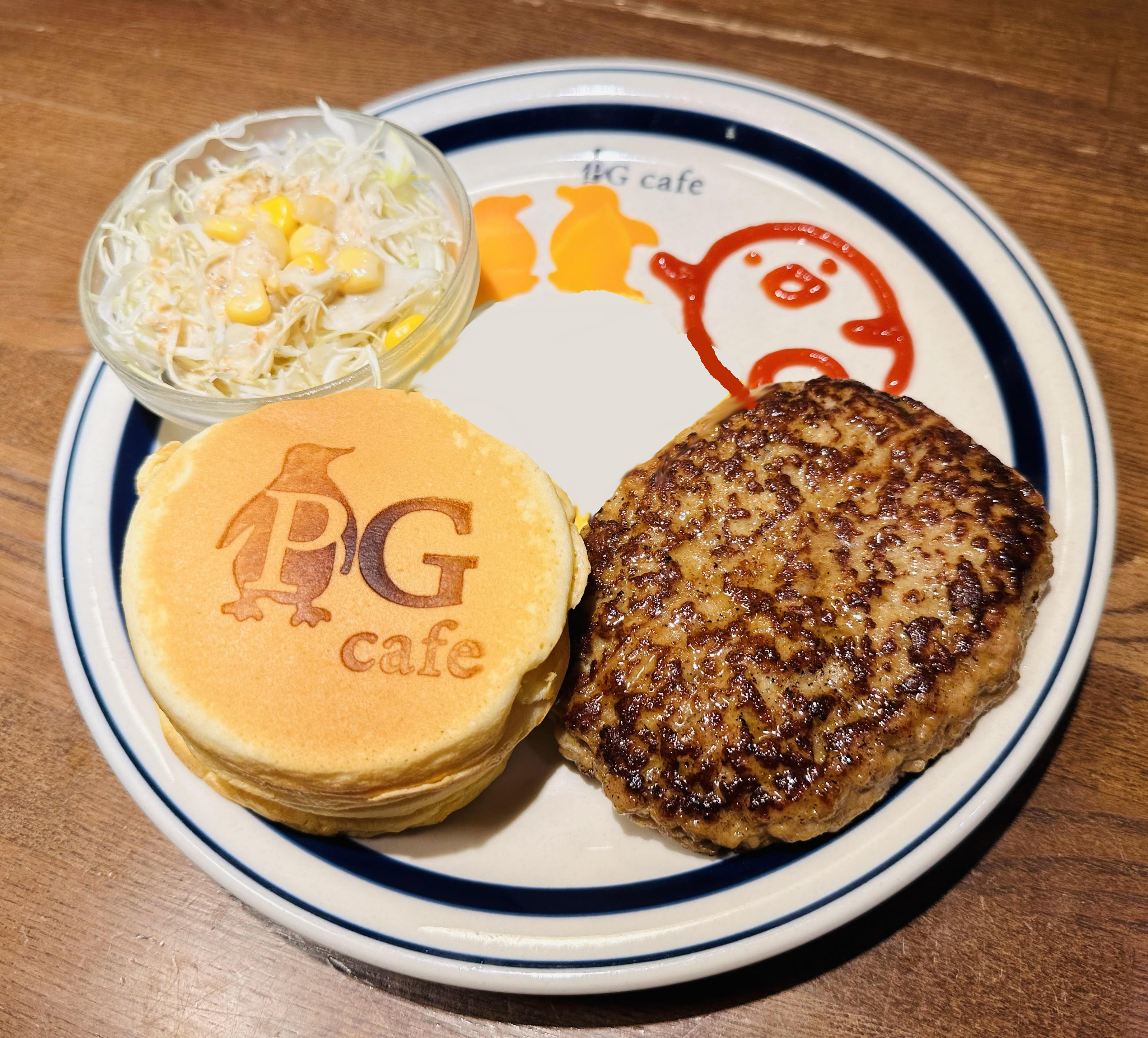 ハンバーグとホットケーキ、ミニサラダが乗ったプレートです