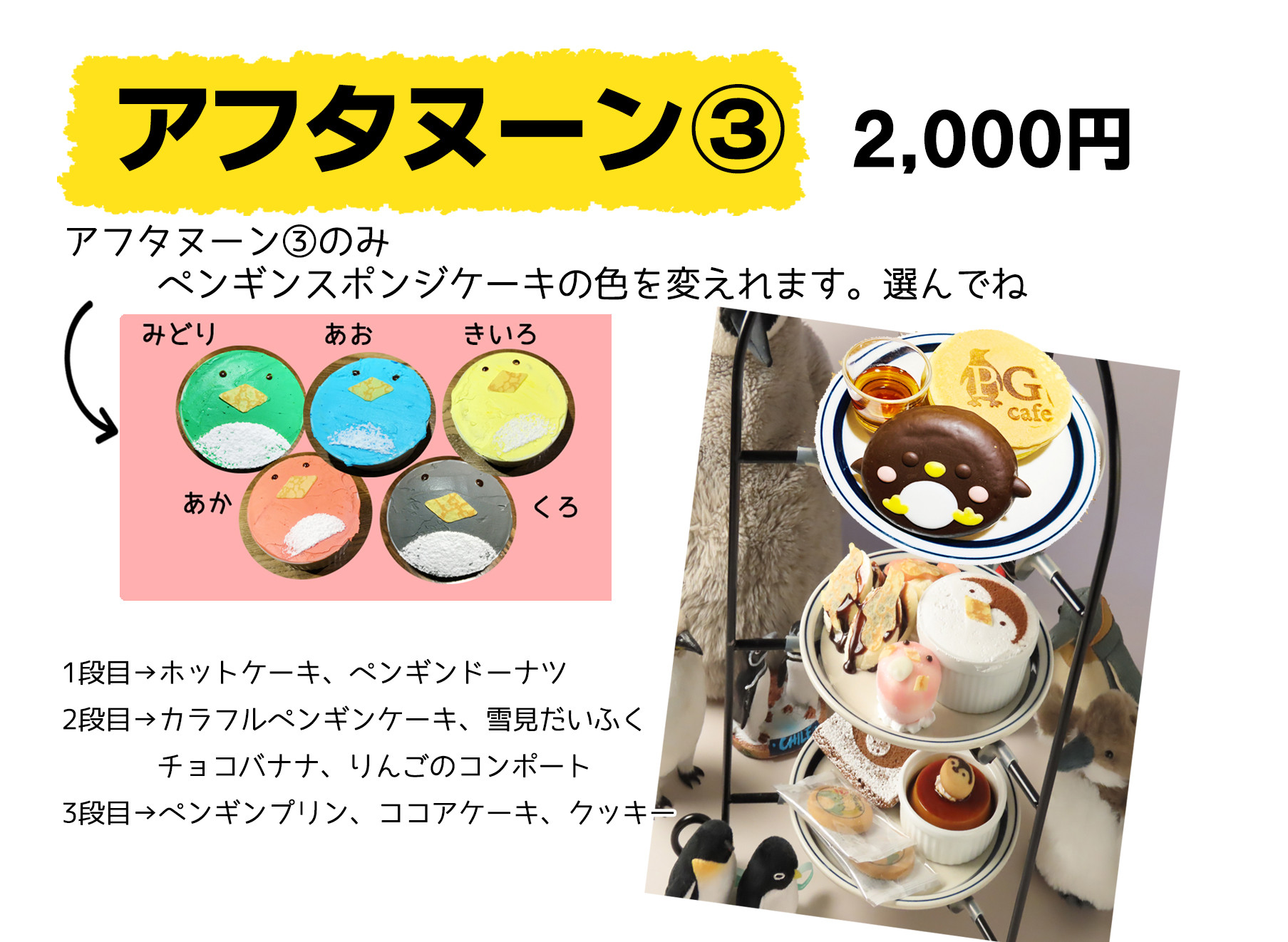 アフタヌーンの③のみペンギンケーキの色が変更できます(※ホイップに色がついているだけです)