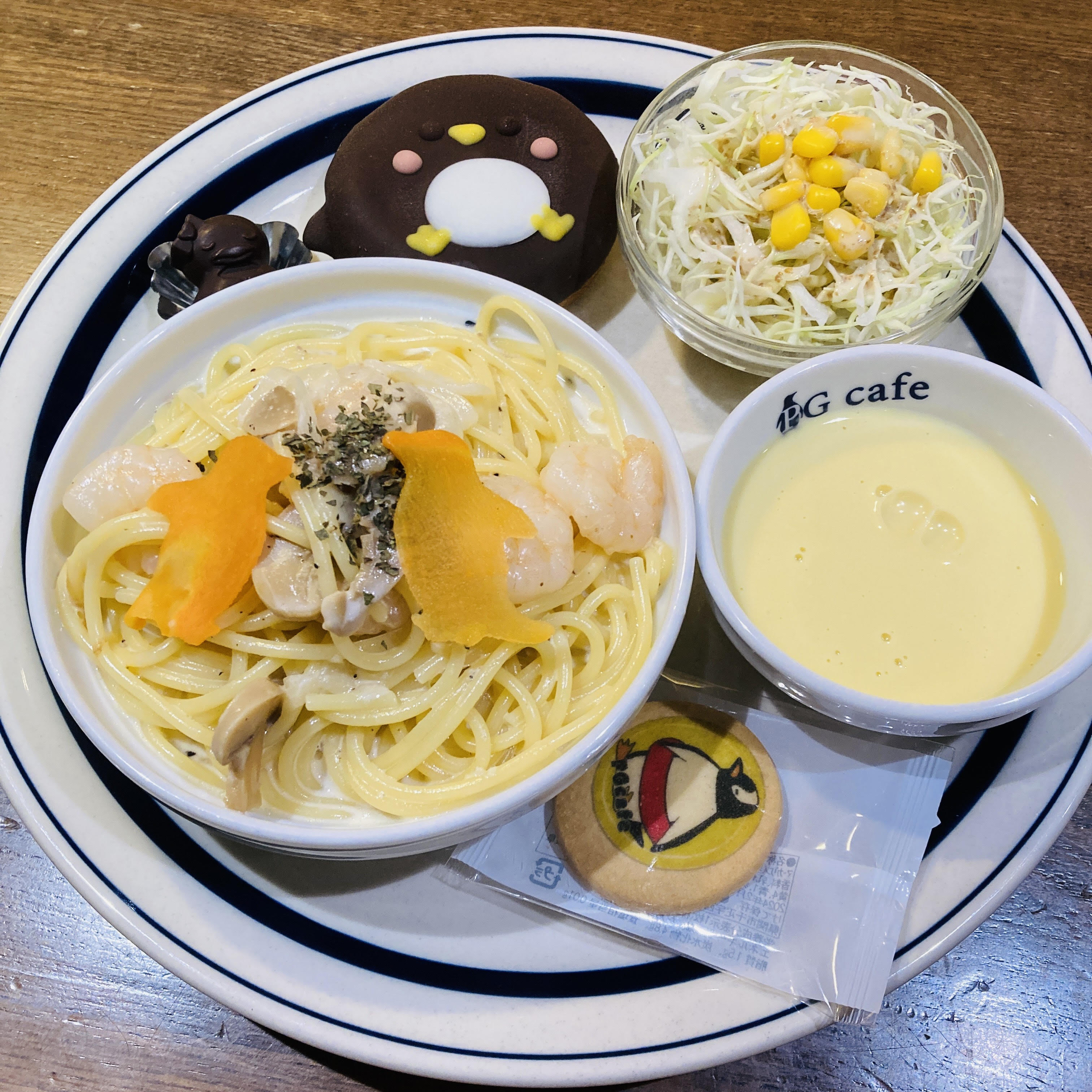(本日のパスタ+ペンギンマシュマロ+コーンスープ+ミニサラダ)