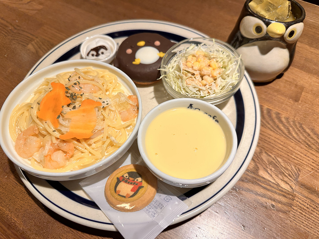 (本日のパスタ+ペンギンマシュマロ+ペンギンクッキー+コーンスープ+ミニサラダ+ペンギンドーナツ)